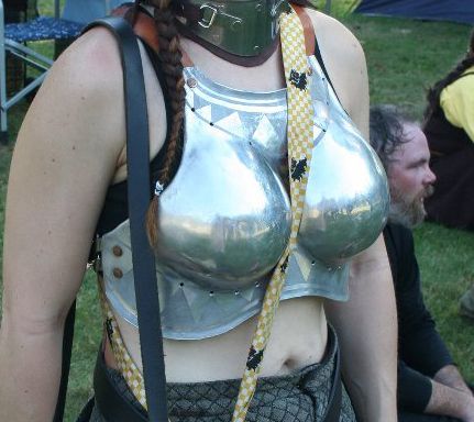 Ça, c’est un plastron pour poitrine. Je l’ai fabriqué. La femme sur la photo a demandé qu’il soit ainsi. Elle se bat avec et je crains en permanence qu’elle tombe violemment et que le plastron lui brise le sternum, malgré le rembourrage. Notez aussi que ce plastron semble parfaitement conçu pour guider les pointes d’épées et les flèches vers son cœur. Elles doivent encore traverser l’armure, mais sincèrement, c’est un défaut de conception [et en plus elle ne protège pas le ventre ni le bas ventre ! Regardez l'armure de Jeanne d'Arc ; la cotte descend jusqu'en haut des cuisses ! (NdT)]. Cependant, l’armure rend bien et la fait se sentir à la fois sexy et balèze. C’est tout aussi important.