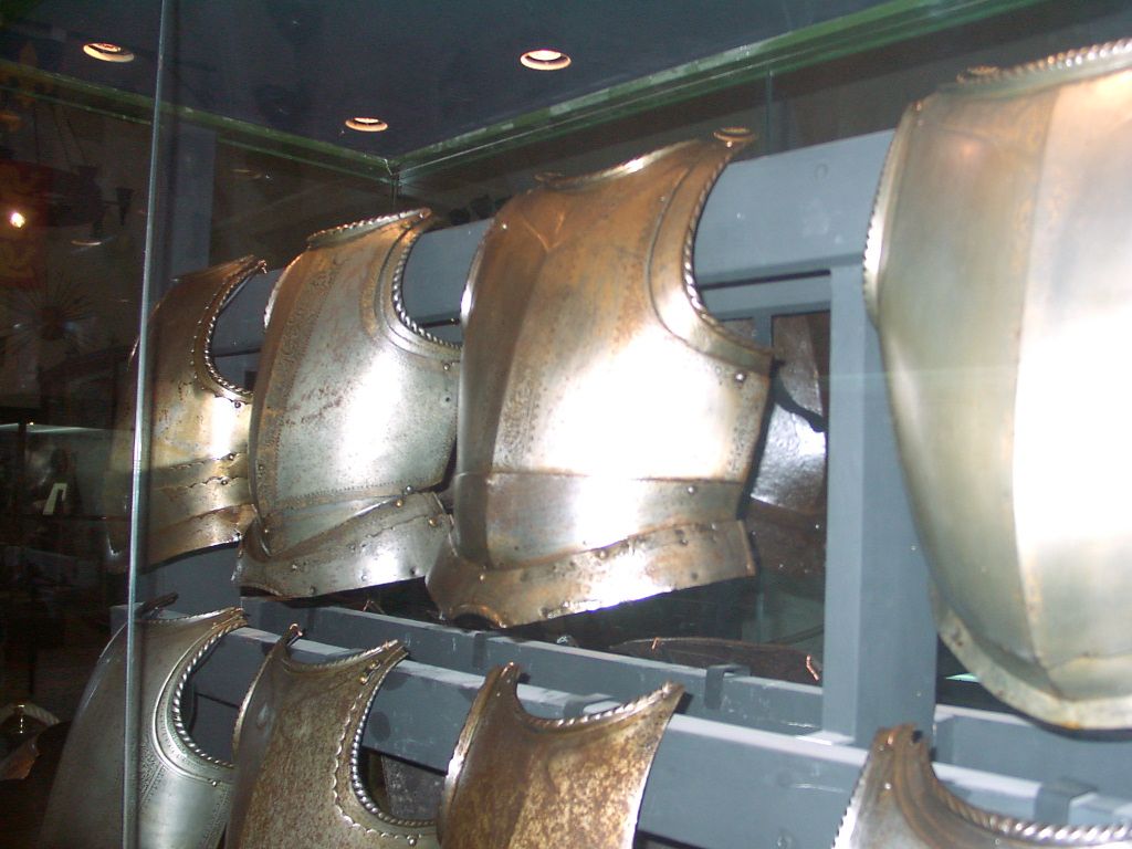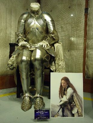 Comme l’indique la pancarte, cette armure provient du film Elizabeth : L’Âge d’or. Elle est superbe. Modelée sur une armure de plates germanique de type gothique, je n’ai qu’une réserve à son sujet : pas de protection du cou. C’est important, mais regardons plutôt ce qu’ils ont bien fait.