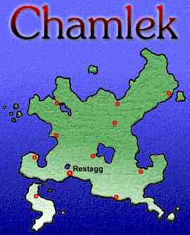carte de ChamlekChamlek est un petit royaume insulaire de quelque 230 000 km² [soit la superficie de la Grande-Bretagne], avec un bon climat et juste quelques collines rocheuses émergeant d’une campagne bien arrosée. Sa population est d'un peu plus de 6,6 millions, pour une densité moyenne de 29 personnes au km² (un tirage au dé moyen).